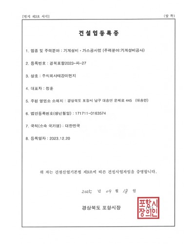 건설업등록증 (기계설비)